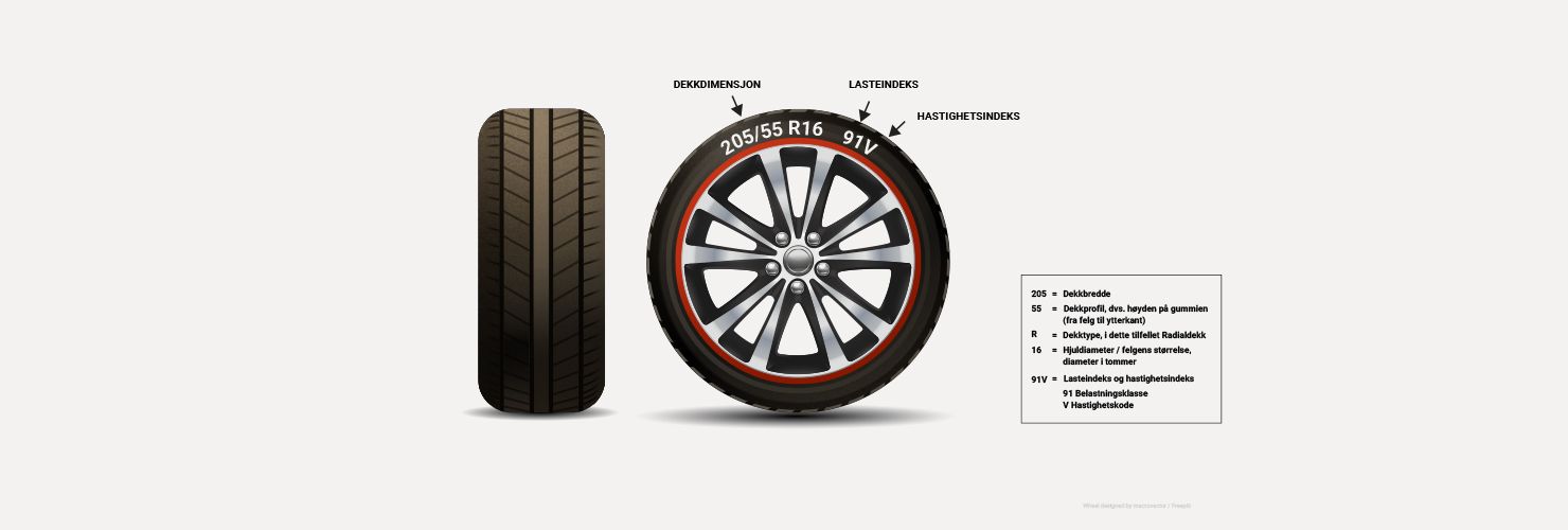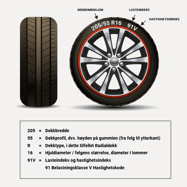 Du finner dekkdimensjon på siden av dekket. Se bilde. De viktigste merkene / tall kan deles inn i tre kategorier: Dekkdimensjon, Lasteindeks og hastighetsindeks samt datomerking.